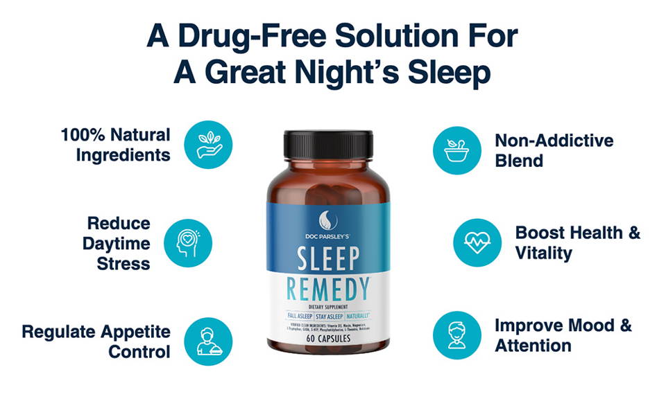 Doc Parsley’s Sleep Remedy helps your body relax and drift off for a quality night of sleep that can result in a more productive day.